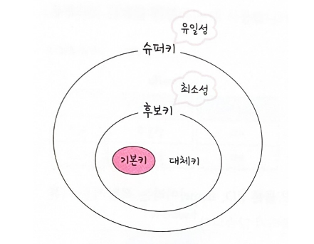 | 후보 키(Candidate Key) | 유일성과 최소성을 만족해서 기본키가 될 수 있는 후보들. |