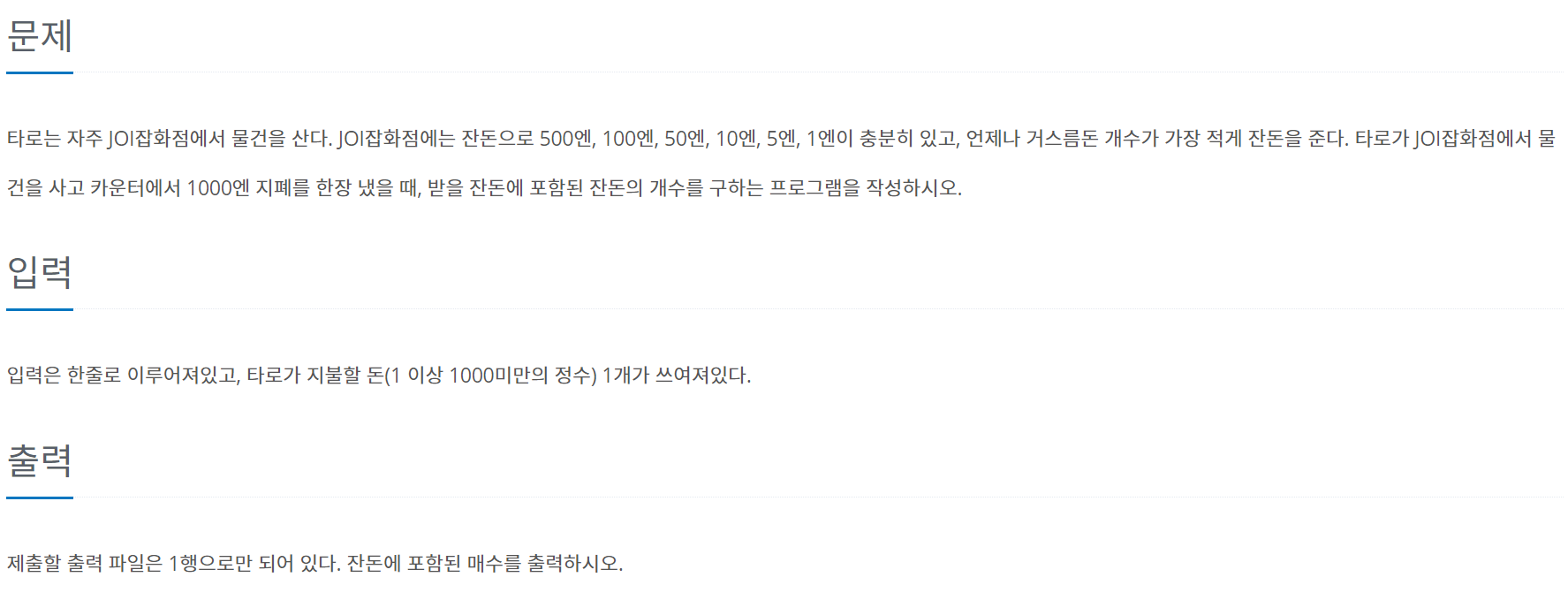 처음에는 정말 직관적으로 큰 잔돈부터 작은 잔돈까지 차례대로 나눠서 몫(동전의 개수)을 count 에 넣고