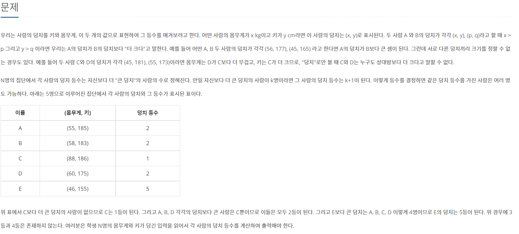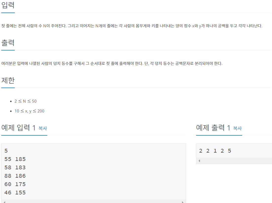 그래서 값을 이중배열 Dungchi 에 넣고, 몸무게와 키 모두 자신보다 작은 사람이 존재하면
