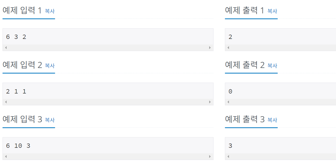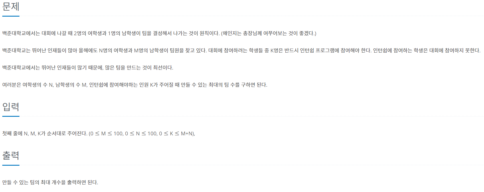 int leftover = W+M-(3*max); // W+M-(3*max) =총인원-참가인원 = 필요없는 사람들