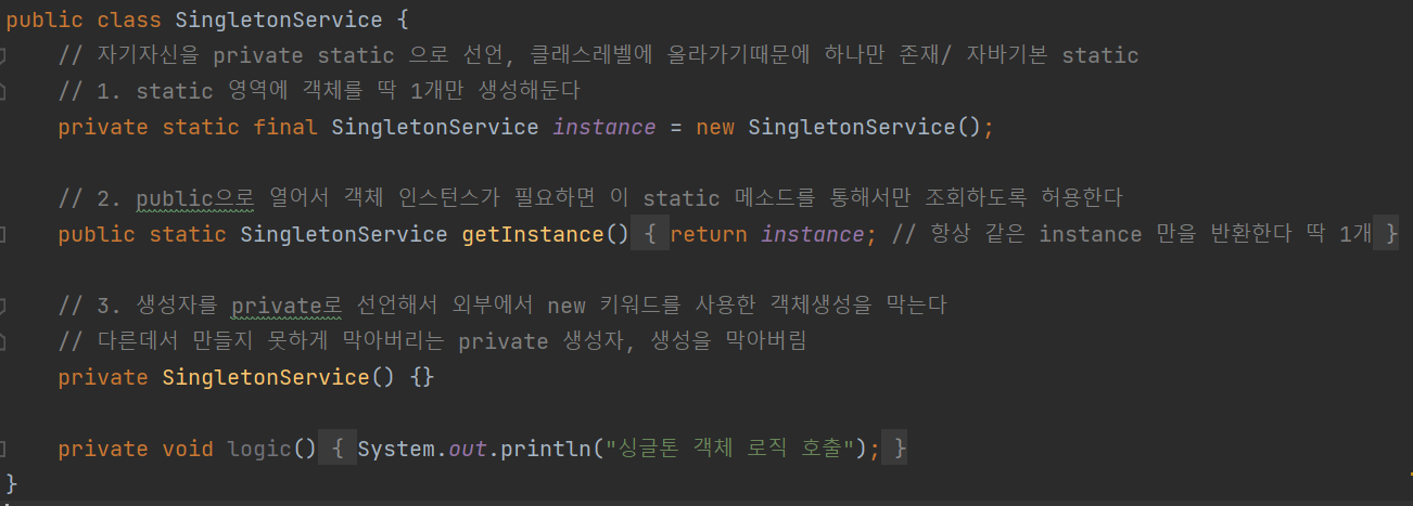 단, 싱글톤 방식을 고려할 때 싱글톤 인스턴스는 상태를 stateful 하게 설계해서는 안된다