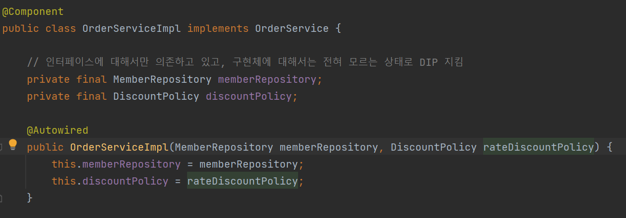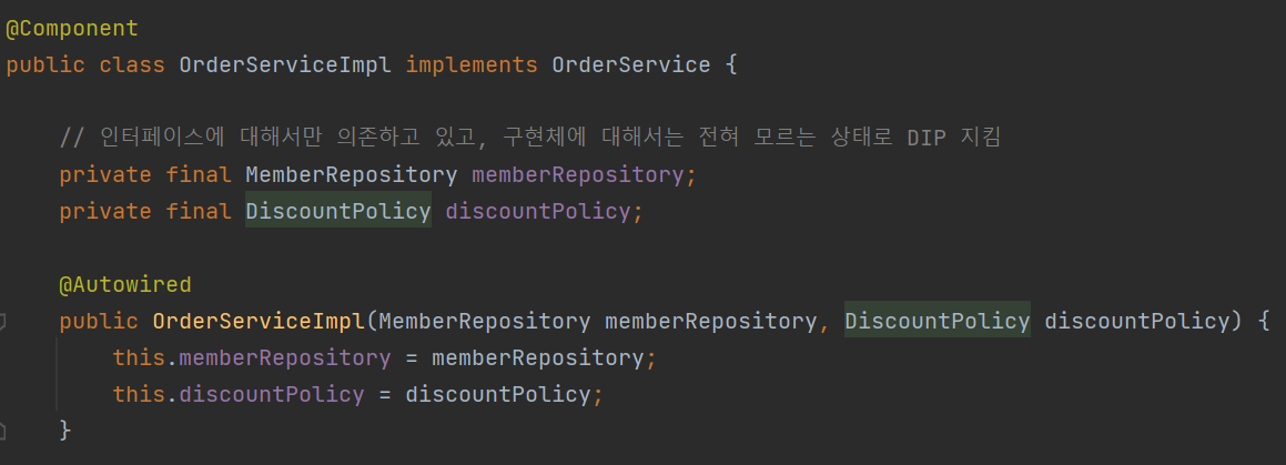 DiscountPolicy discountPolicy -> DiscountPolicy rateDiscountPolicy 로 이름을 바꿔 구분이 가능하게 해주었다