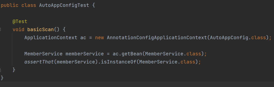@ComponentScan 을 넣은 AutoAppConfig 클래스를 설정정보로 넘겨주고 스프링 컨테이너를 생성하고 테스트
