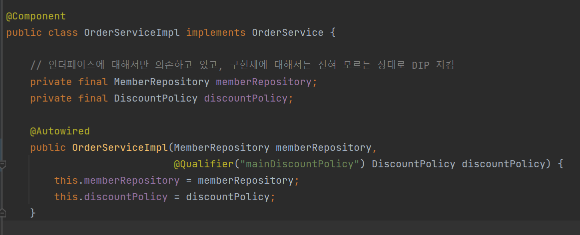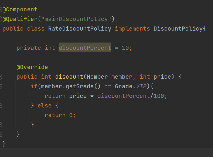 RateDiscountPolicy 클래스에 @Qualifier 구분자 어노테이션을 추가해줌으로써 "mainDiscountPolicy"라는 이름으로