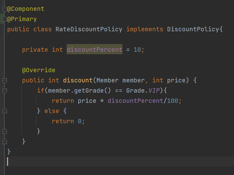 RateDiscountPolicy 에 @Primary 를 붙이면 이 빈이 우선순위를 갖고 가장 먼저 매칭된다