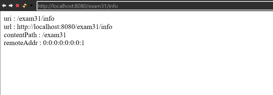 remoteAddr : 요청한 클라이언트의 주소 ( 접속한 운영체제에 따라 다를수 있지만 현재 로컬pc 에서 접속했기 때문에