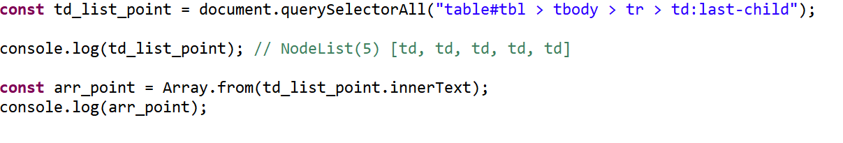 Array.from() 메소드로 만든 배열을 변수에 넣고 arr_point.map() 안에서 innerText 를 사용해 값을 가져왔다.