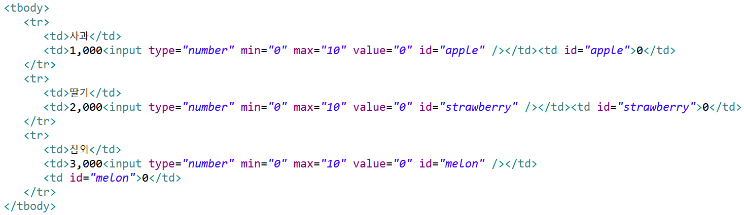 예를들어 위에서는 id="melon" 인 td 태그가 줄바꿈이 일어나도 같은 id 를 주었기 때문에 undefined 가 나오지 않고