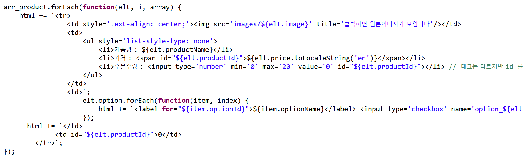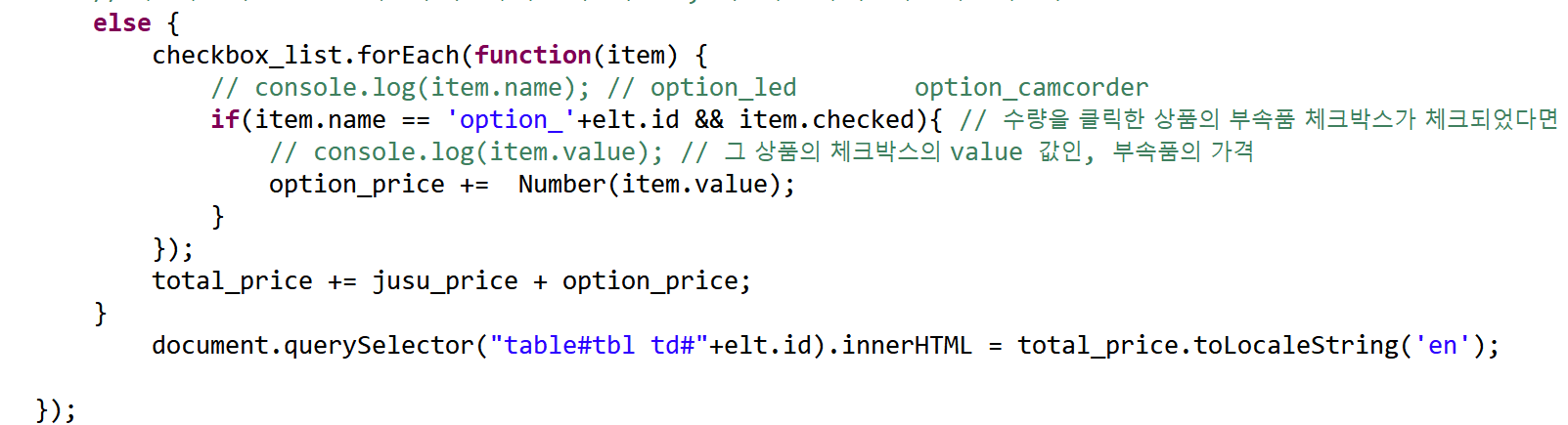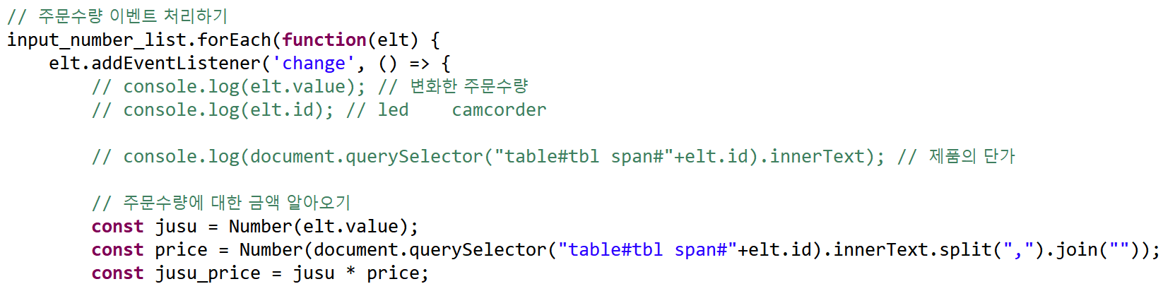 제품 각각에 대한 가격, 주문수량, 총 주문금액을 입력하는 태그에 led, camcorder 라는 공통된 id 값을 가지게 된 것이다.