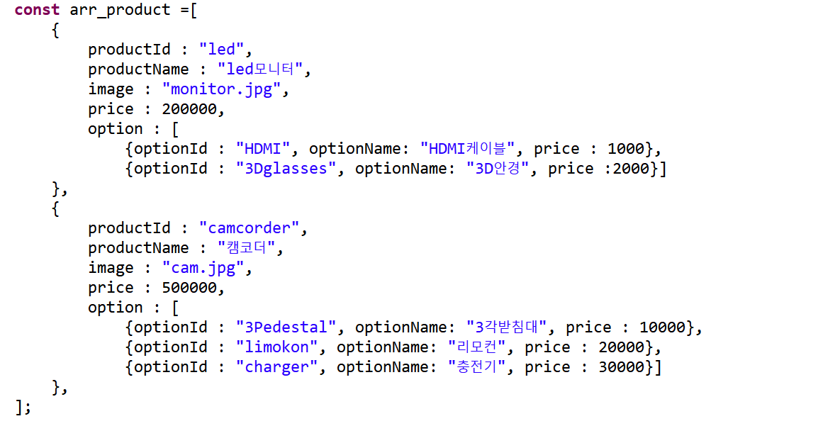 아래와 같이 객체배열 arr_product 를 선언했다.