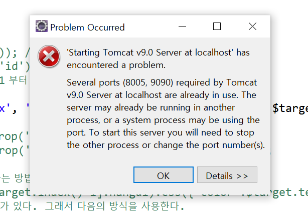 매일 이클립스를 사용하다보니 이클립스 창을 닫거나 노트북 전원을 끄지 않고 그냥 절전만 해놓은 상태로 써왔는데, 이미 실행된 톰캣 위에다가 또 Run 을 요청해서 이런 오류가 난 것같다. Run 할 때는 이미 톰캣이 구동되었는지 확인 한번쯤은 해야겠다.